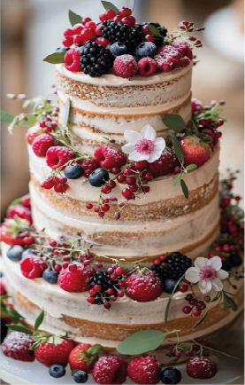 Quindi se ne deduce che ad ogni stile, a grandi linee, corrisponde una precisa tipologia. Quella più adatta lo stile rustico o boho ad esempio potrebbe essere la “Torta nuda” (niente di proibito tranquilli) altrimenti detta Naked cake, prende questo nome perchè non è prevista alcuna copertura finale, lasciando intravedere gli strati e la farcitura che la compongono, decorata generalmente con frutti di bosco e fiori eduli freschi.