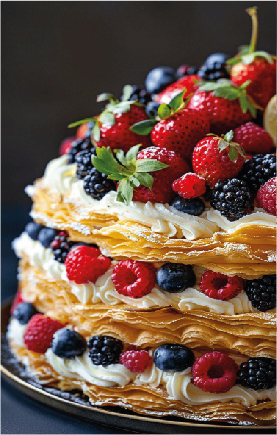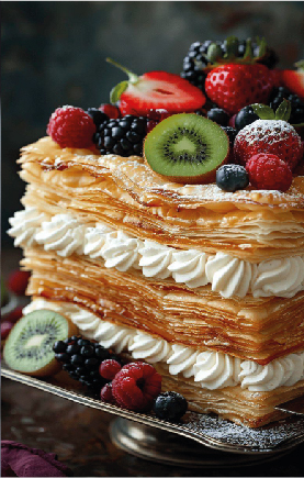 Altra tipologia la Millefoglie a piani: Una torta elegante e golosa, composta da strati di pasta sfoglia, crema e panna.